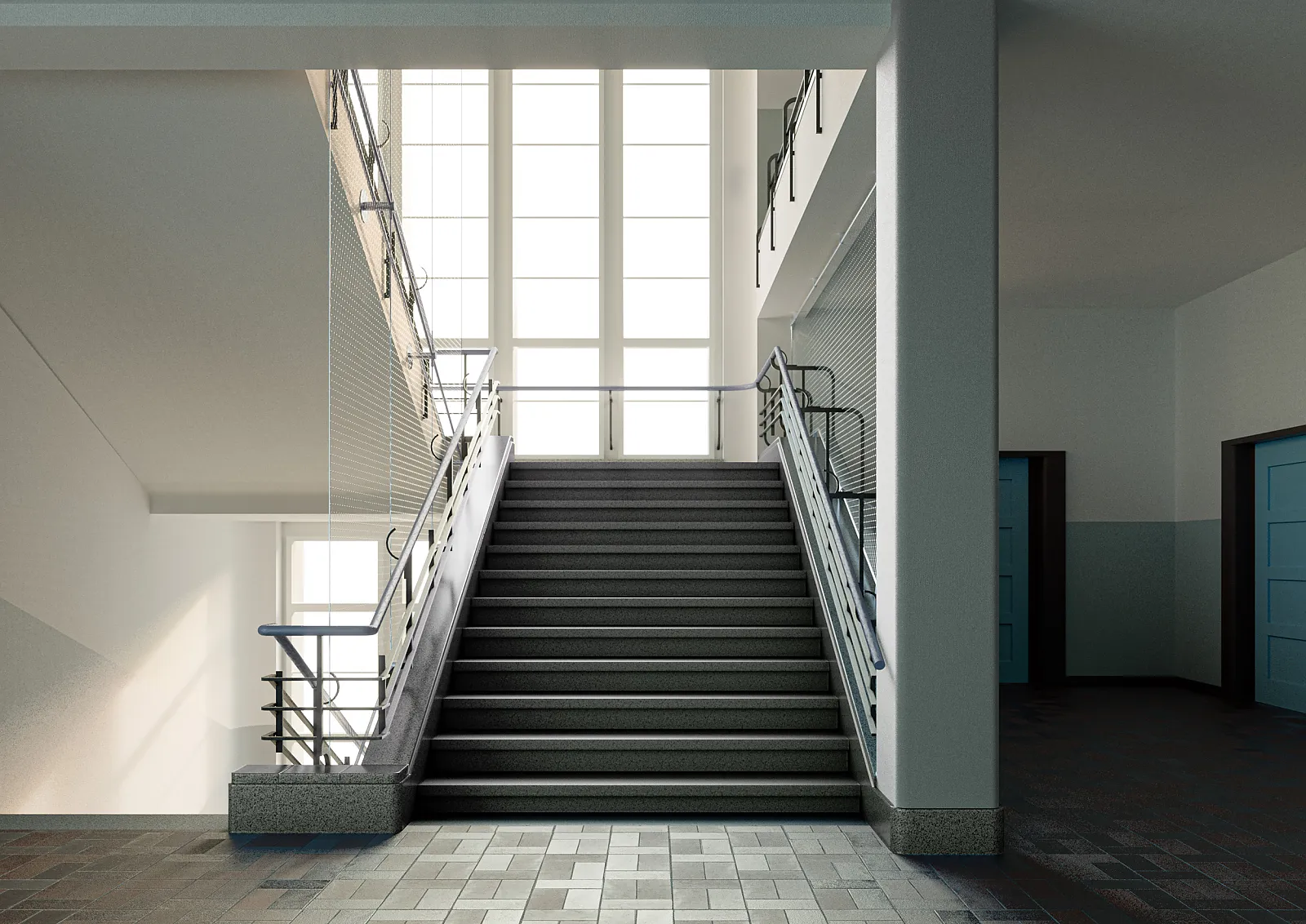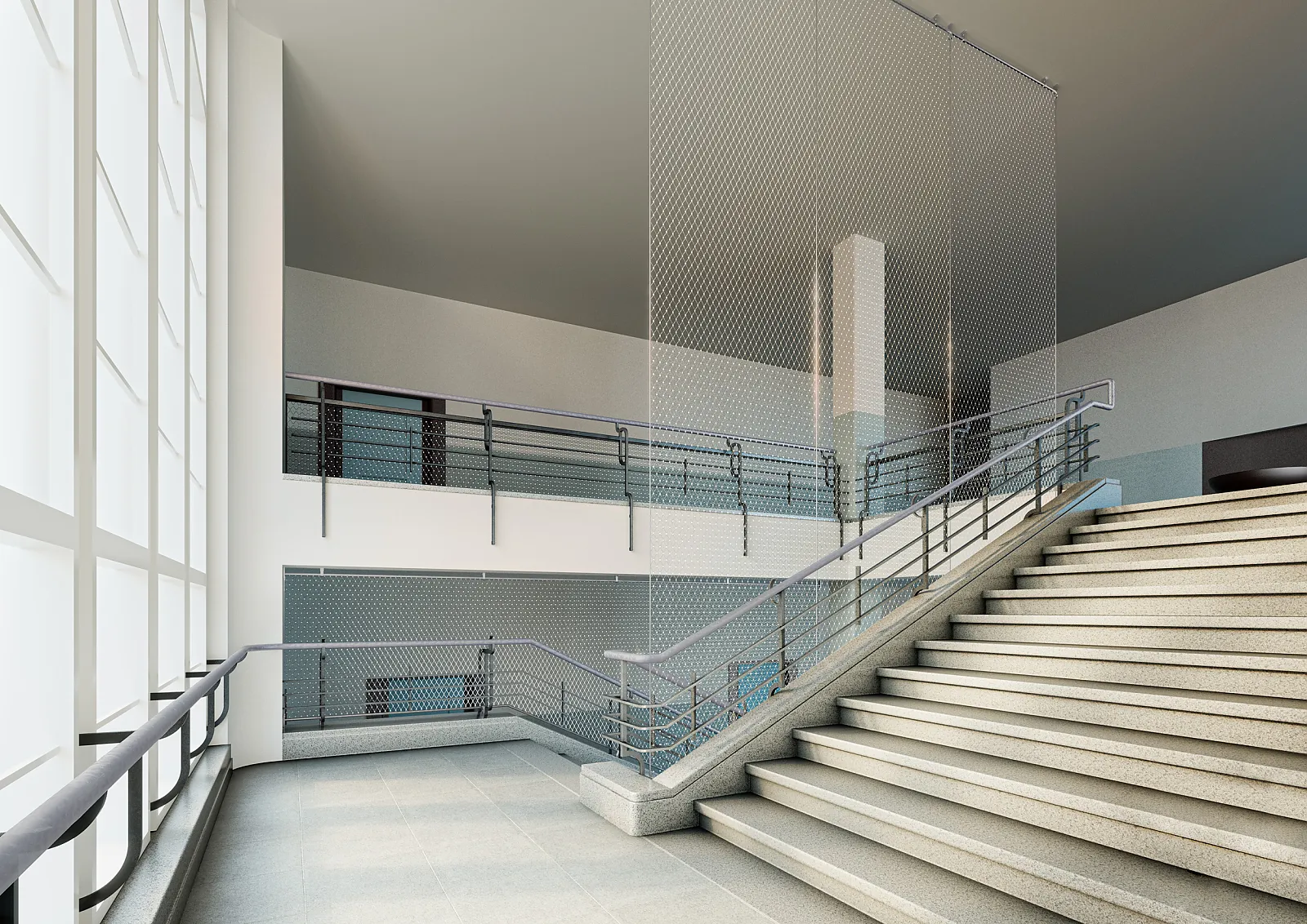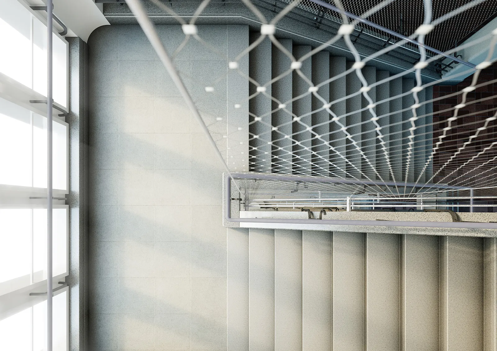 Die Konzeptidee basiert auf einem filigranen Gewebe aus Metall, welches in den vorhandenen «Zwischen»-Raum eingefügt wird. Unabhängig von der bestehenden Geländerstruktur wird so die Absturzsicherung gelöst.
