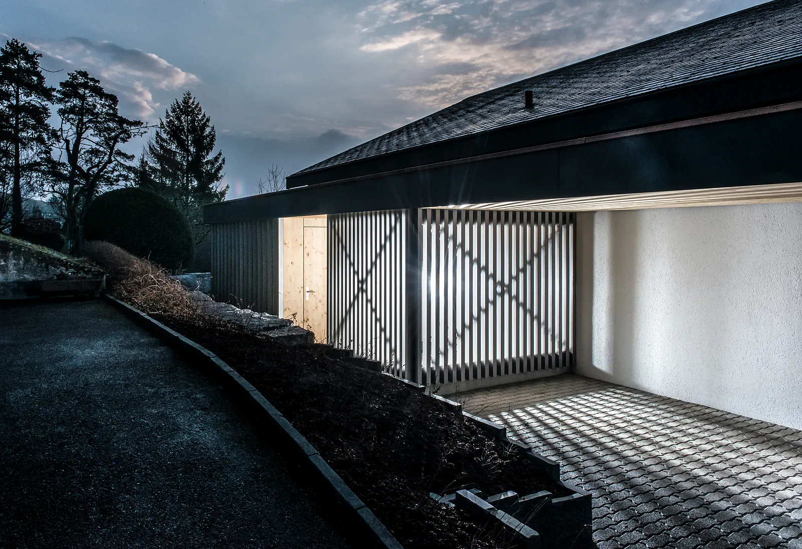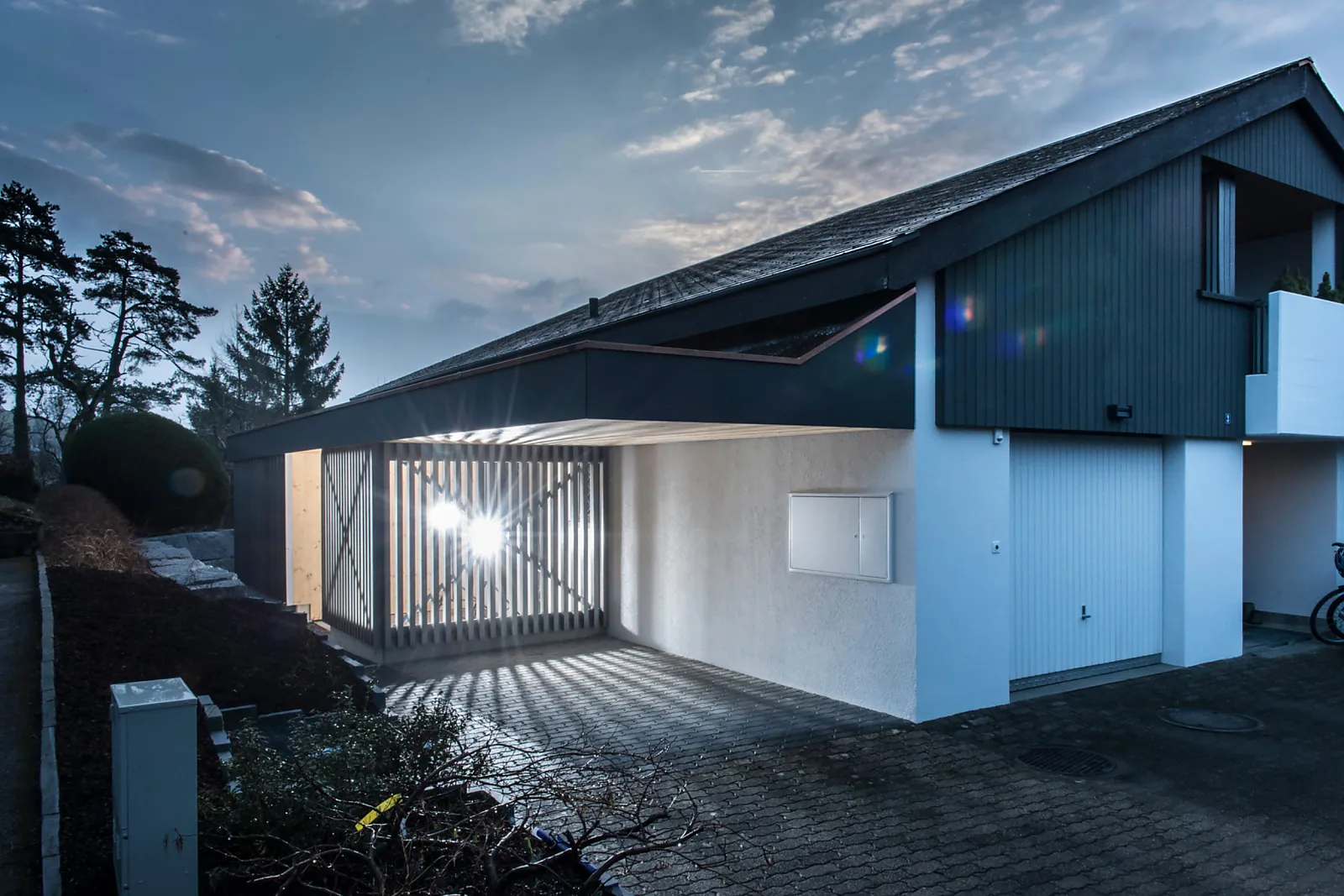 Trotz des grosszügigen Raumangebotes des bestehenden Einfamilienhauses aus den 70er-Jahren fehlten die Nebenräume für Garten und Unterhalt wie auch Parkierungsmöglichkeiten für ein zusätzliches Auto und die Fahrräder. In enger Zusammenarbeit mit der Bauherrschaft entstand ein schlichter Baukörper in Holz, der mit seiner stattlichen Auskragung und dem Spiel der Fassade das bestehende Wohnhaus zeitlos ergänzt und aufwertet.