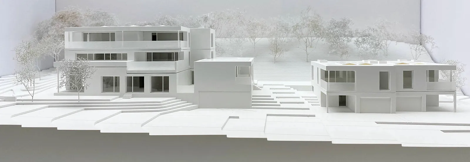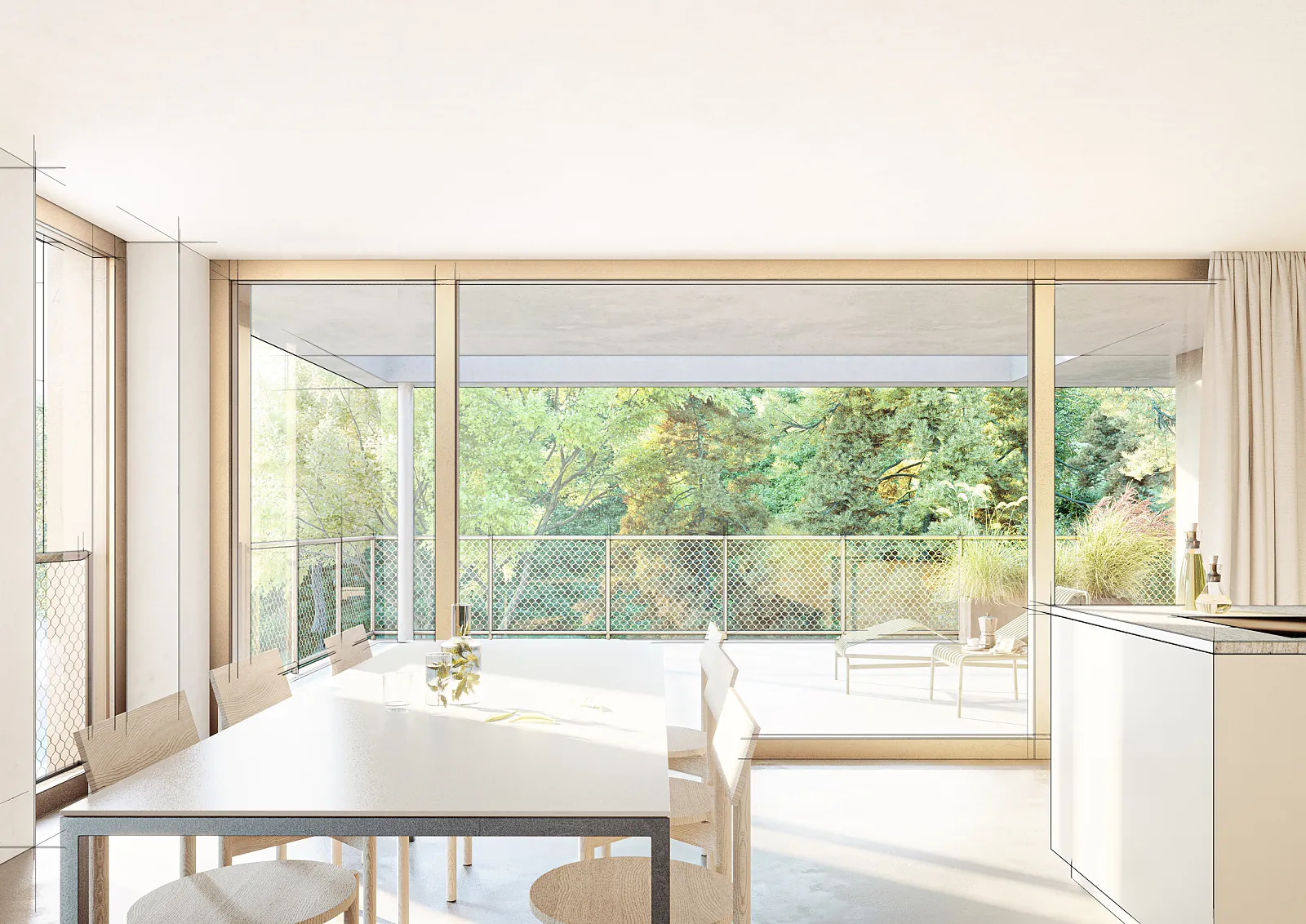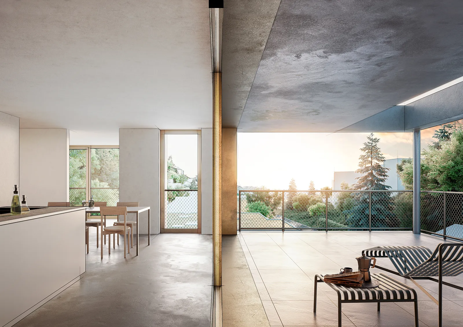 Die beiden «Kluusbach»-Gebäude bilden den Schlusspunkt der Häuserzeile an der Randenstrasse im bevorzugten Wohnquartier Breite. Aufgrund der ruhigen Lage am Waldrand sowie der individuell konzipierten Grundrisse profitieren die Bewohnerinnen und Bewohner von besonders viel Privatsphäre. Die grosszügig gestalteten Fenster inszenieren den Grünraum und erlauben dem Licht, sich im Gebäudeinnern auszubreiten, unterstützt von den teilweise überhohen Räumen mit Galerie bzw. Splitlevel.