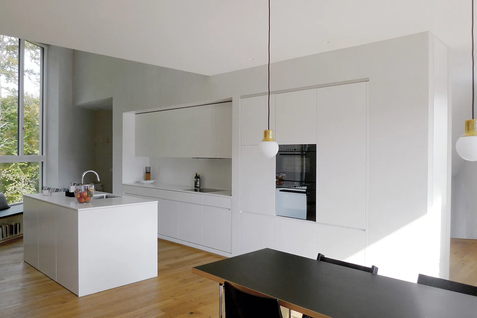 Durch einen zentralen Nord-Süd orientierten «Hallenraum», der den Mittelpunkt des Wohnens darstellt und die gesamte Grundstücktiefe erlebbar macht, werden die Schlaf- und Nebenräume verbunden. Ein zweigeschossiger Bereich im Obergeschoss verbindet dieses Zentrum des Hauses.