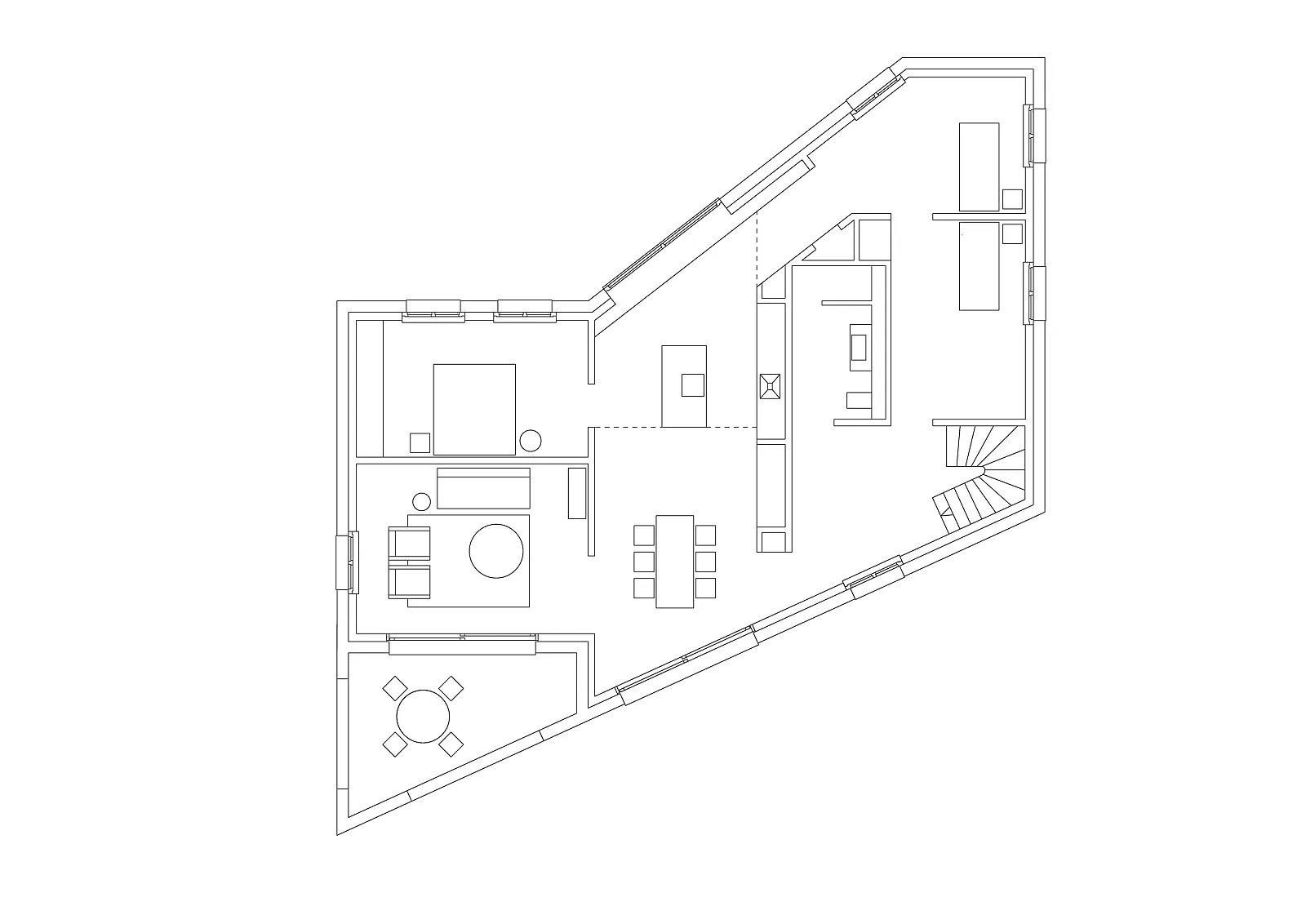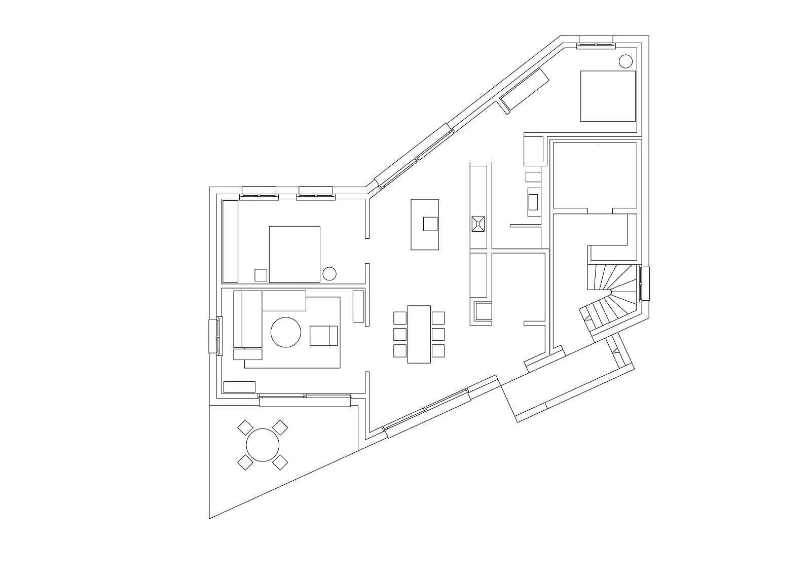 Für den Entwurf stark prägend sind die Qualität des Aussenraumes und die polygonale Form des Grundstückes, im Besonderen der nordseitige Einschnitt sowie die engen Reglementierungen bezüglich dessen Bebaubarkeit dessen. Diese Faktoren widerspiegeln sich in der Gebäudeform, der Raumstruktur und der Situierung.