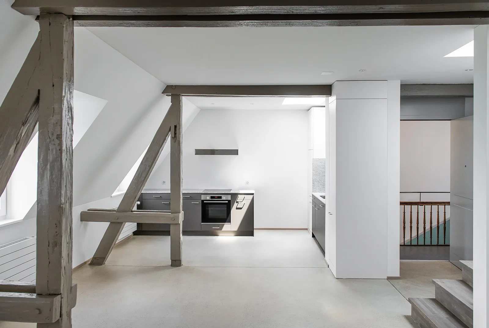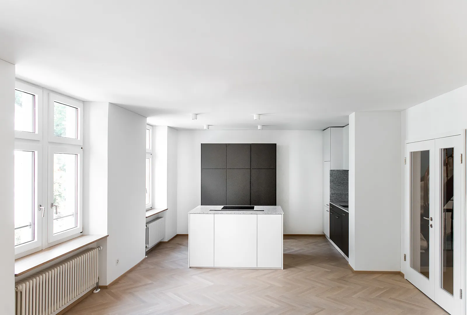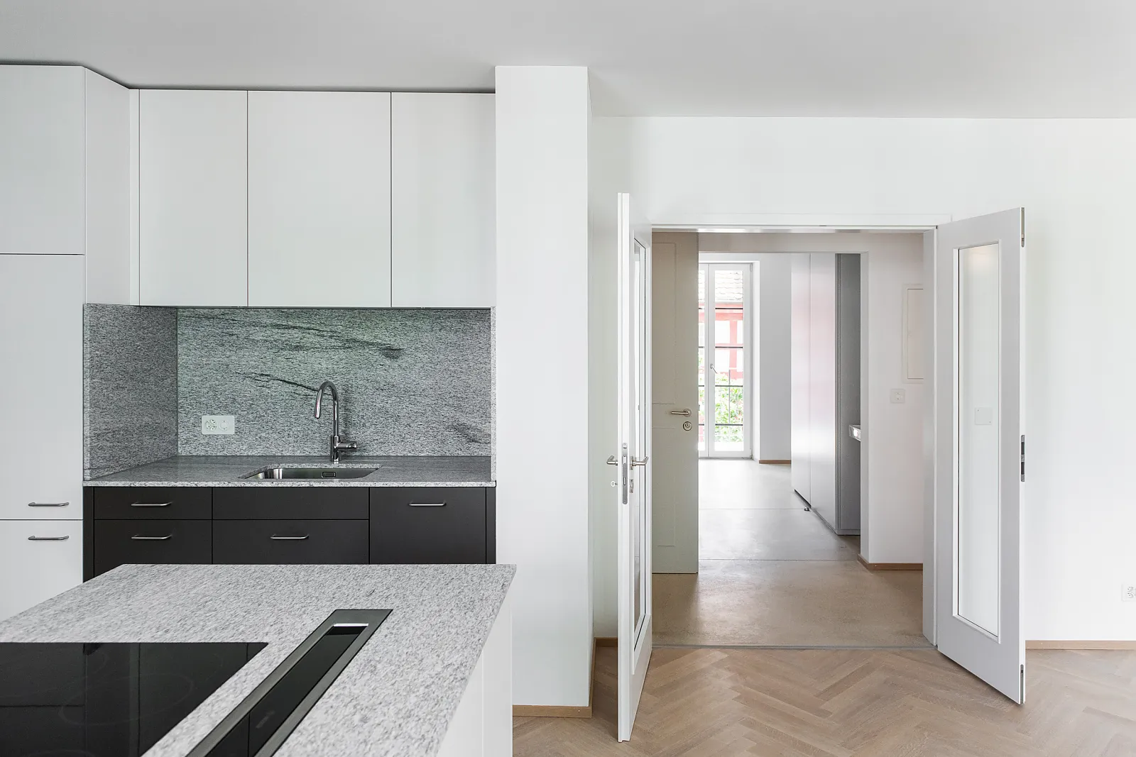 Die Wohnungen in den Obergeschossen wurden bei der Sanierung auf die statische Raumunterteilung zurückgebaut. Um eine räumliche Grosszügigkeit zu erzielen, wurden Türöffnungen vergrössert und Querbezüge geschaffen.