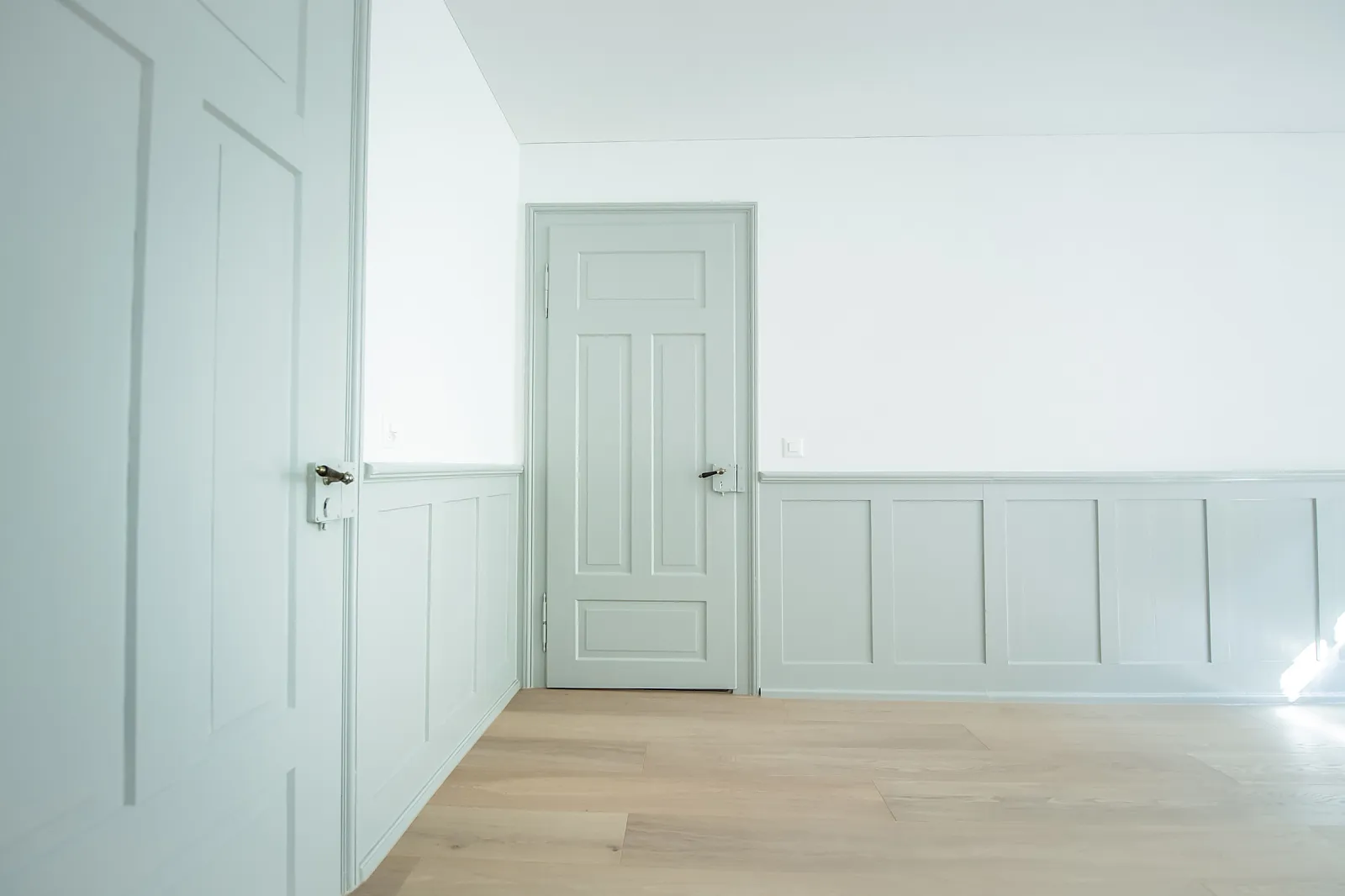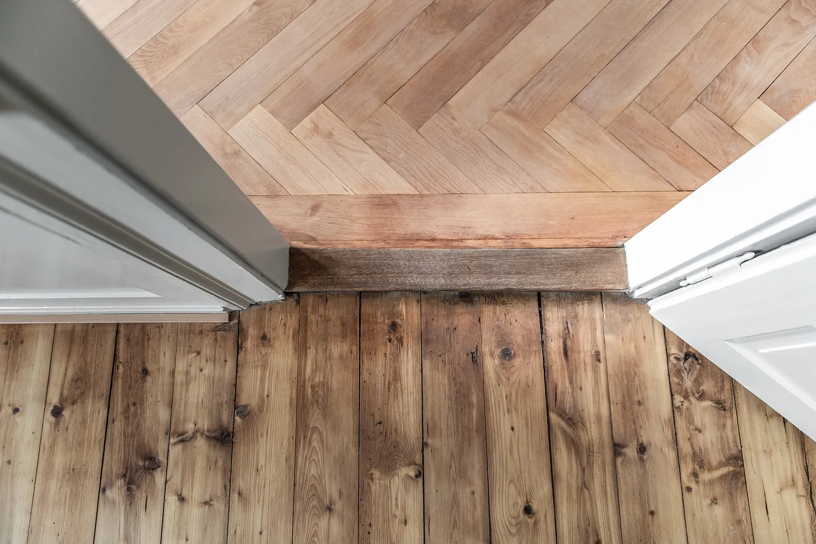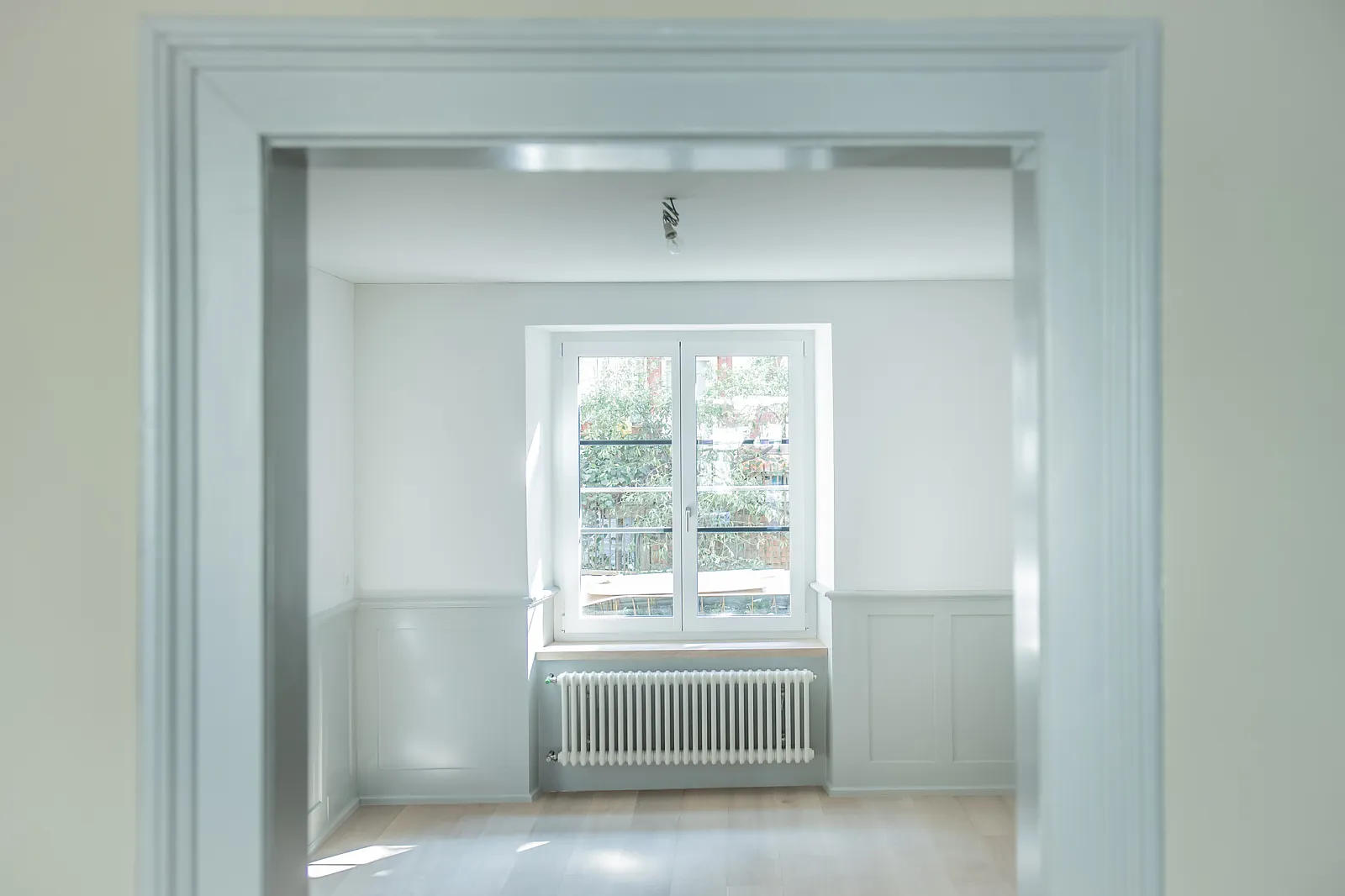 Die Wohnungen in den Obergeschossen wurden bei der Sanierung auf die statische Raumunterteilung zurückgebaut. Um eine räumliche Grosszügigkeit zu erzielen, wurden Türöffnungen vergrössert und Querbezüge geschaffen.