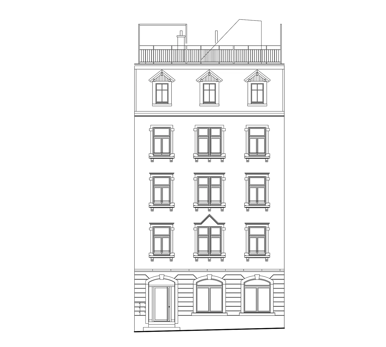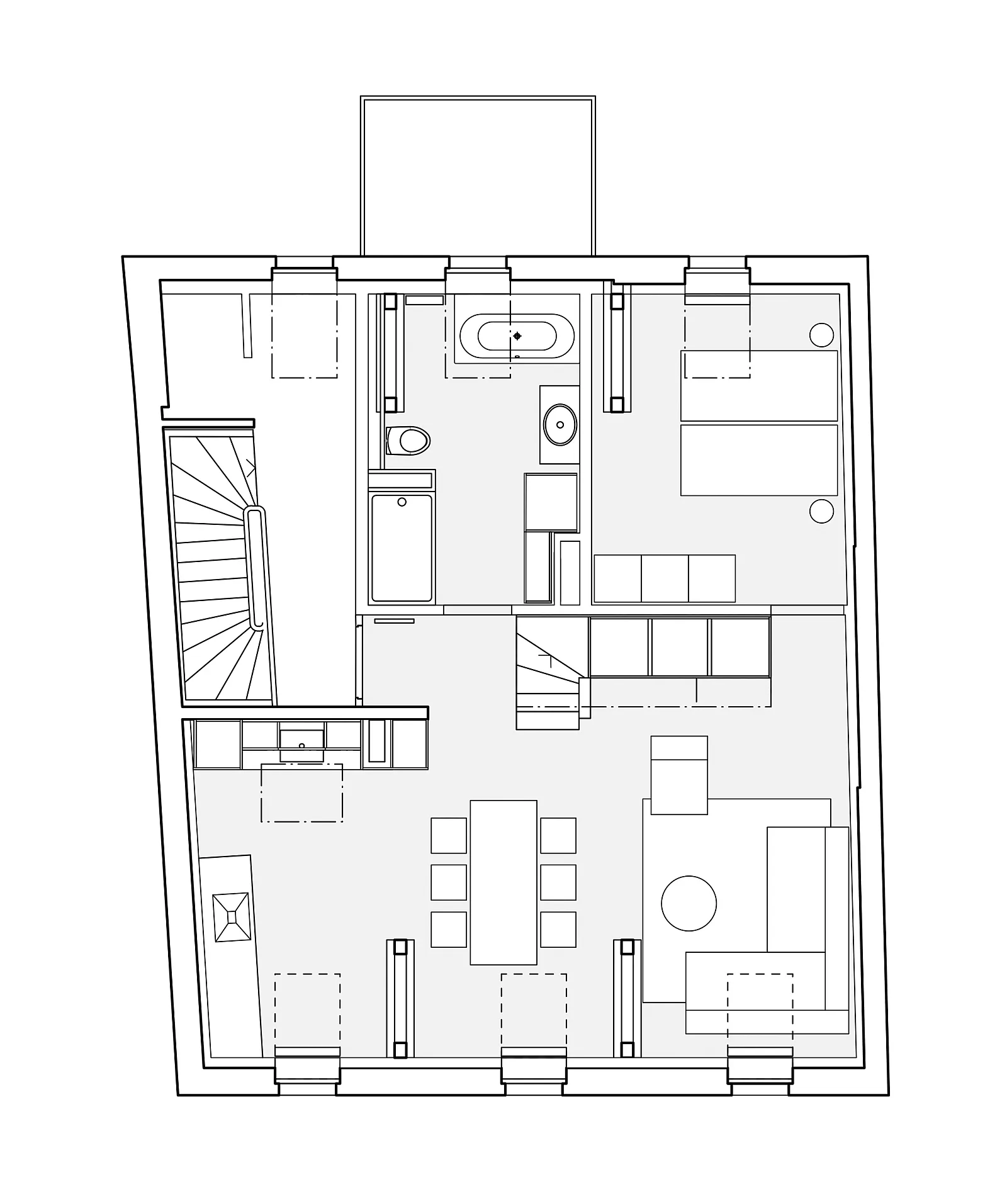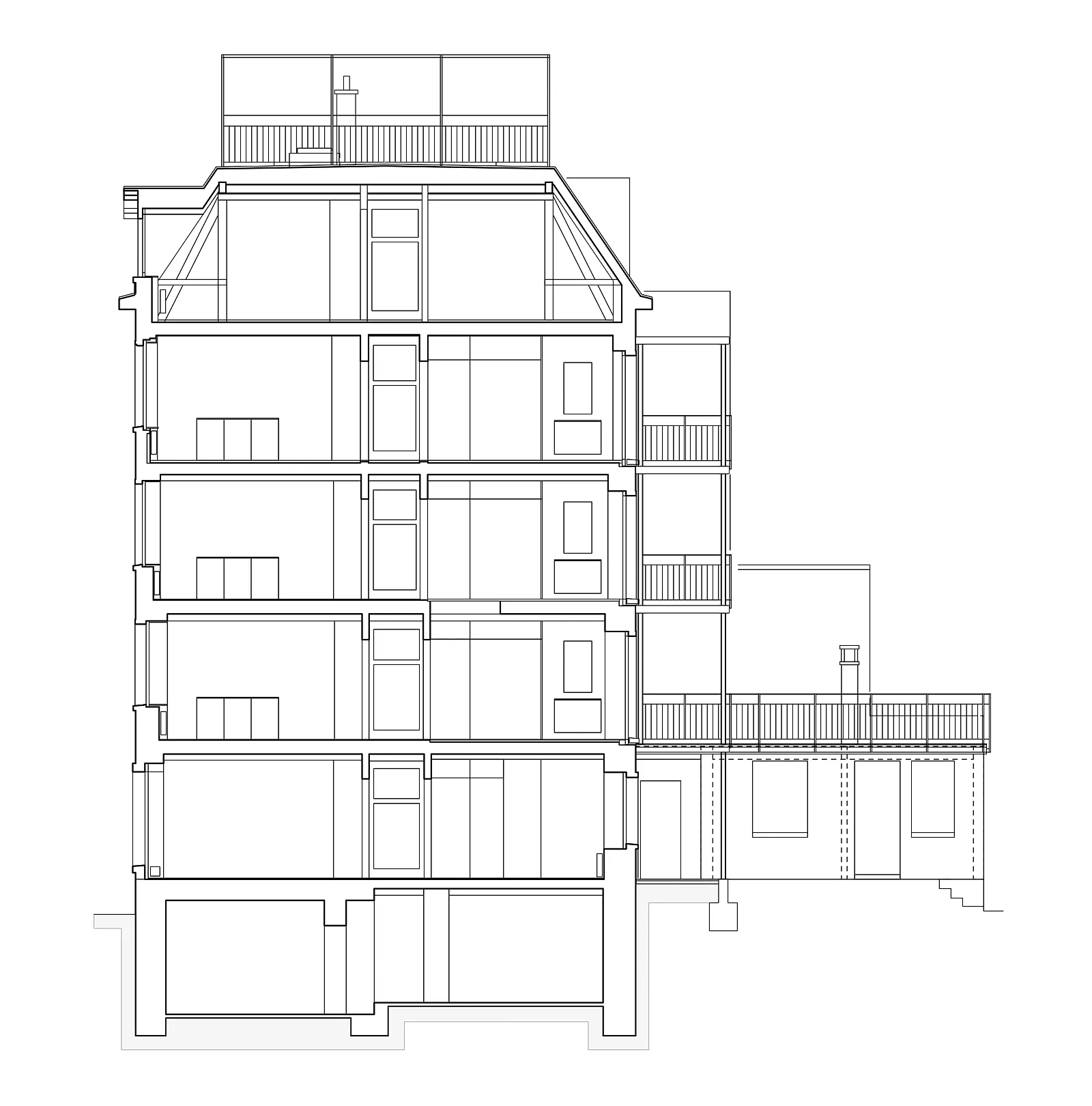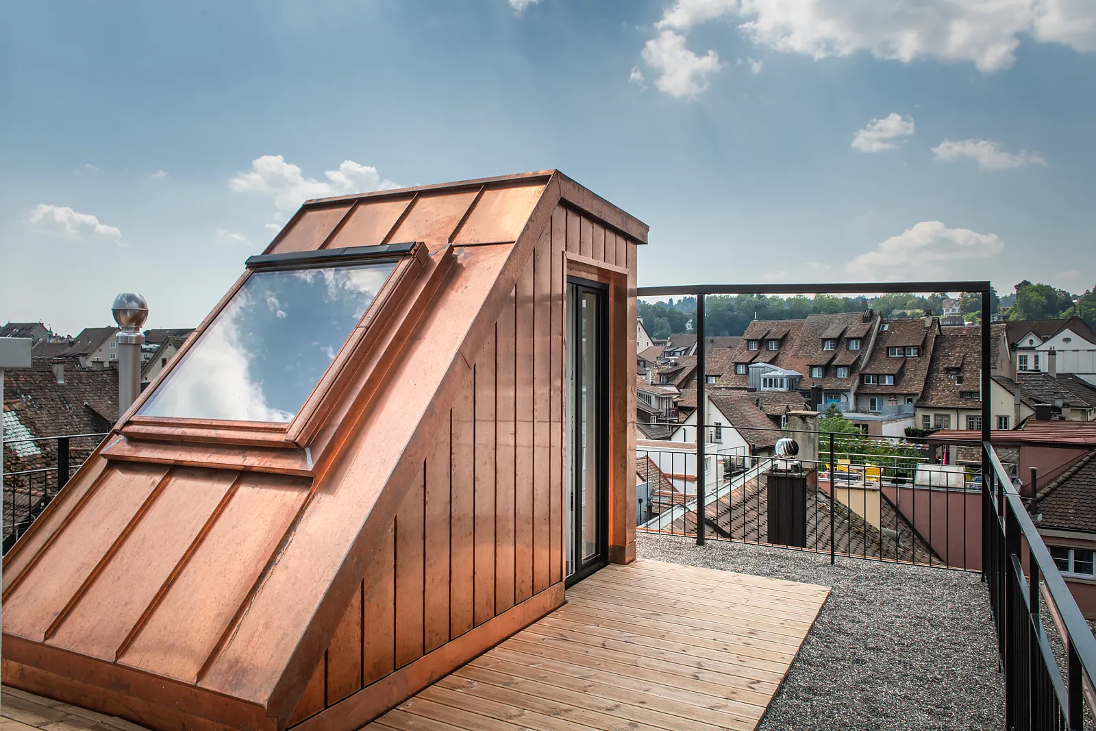 Bei der Sanierung des Hauses wurde das gesamte Dachgeschoss neu gedämmt und die bestehenden Mansardenzimmer zu einer Wohnung umgebaut. Der Zugang zur Dachterrasse wurde neu gestaltet und die Zinne zur Dachterrasse ausgebaut.