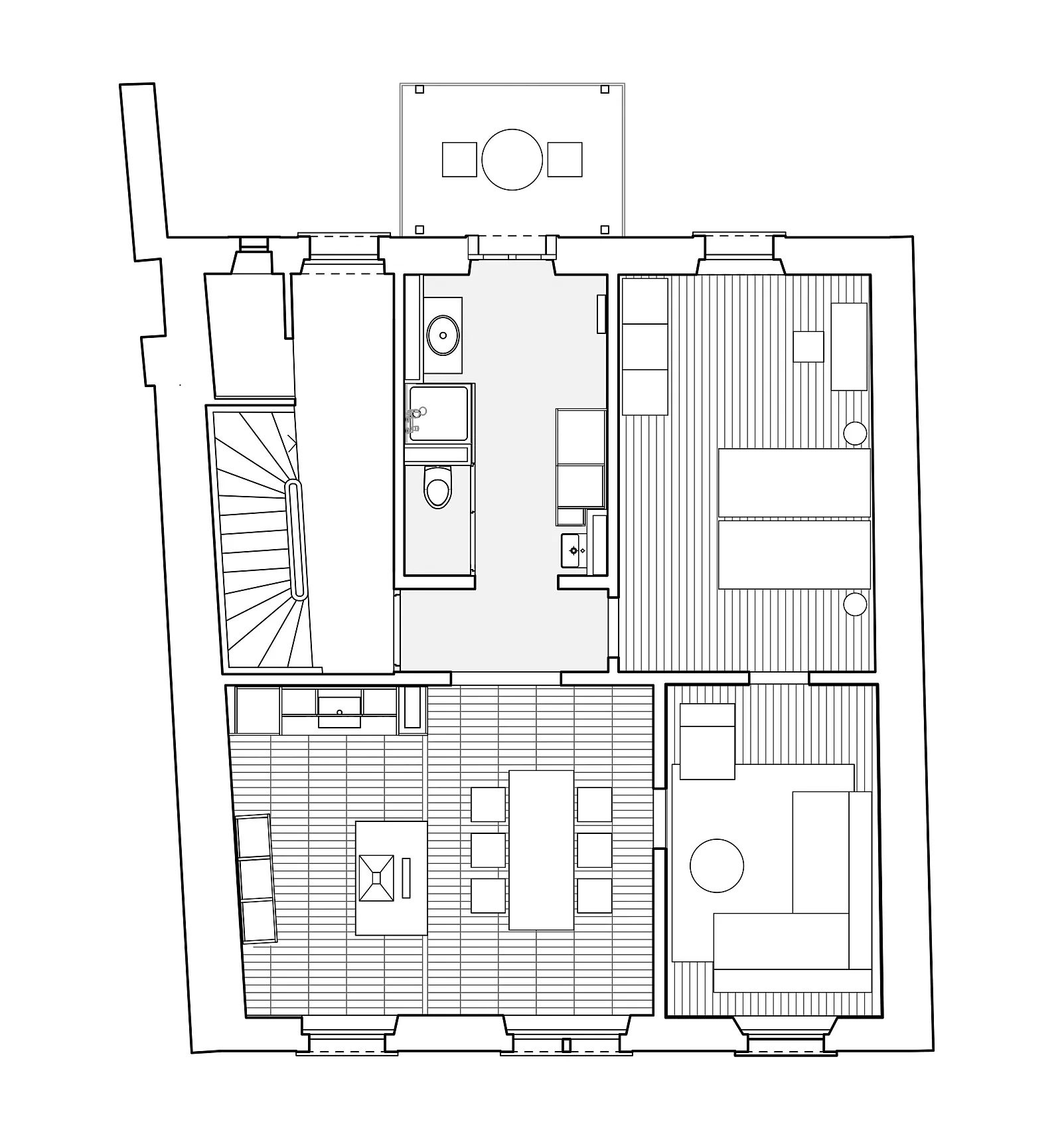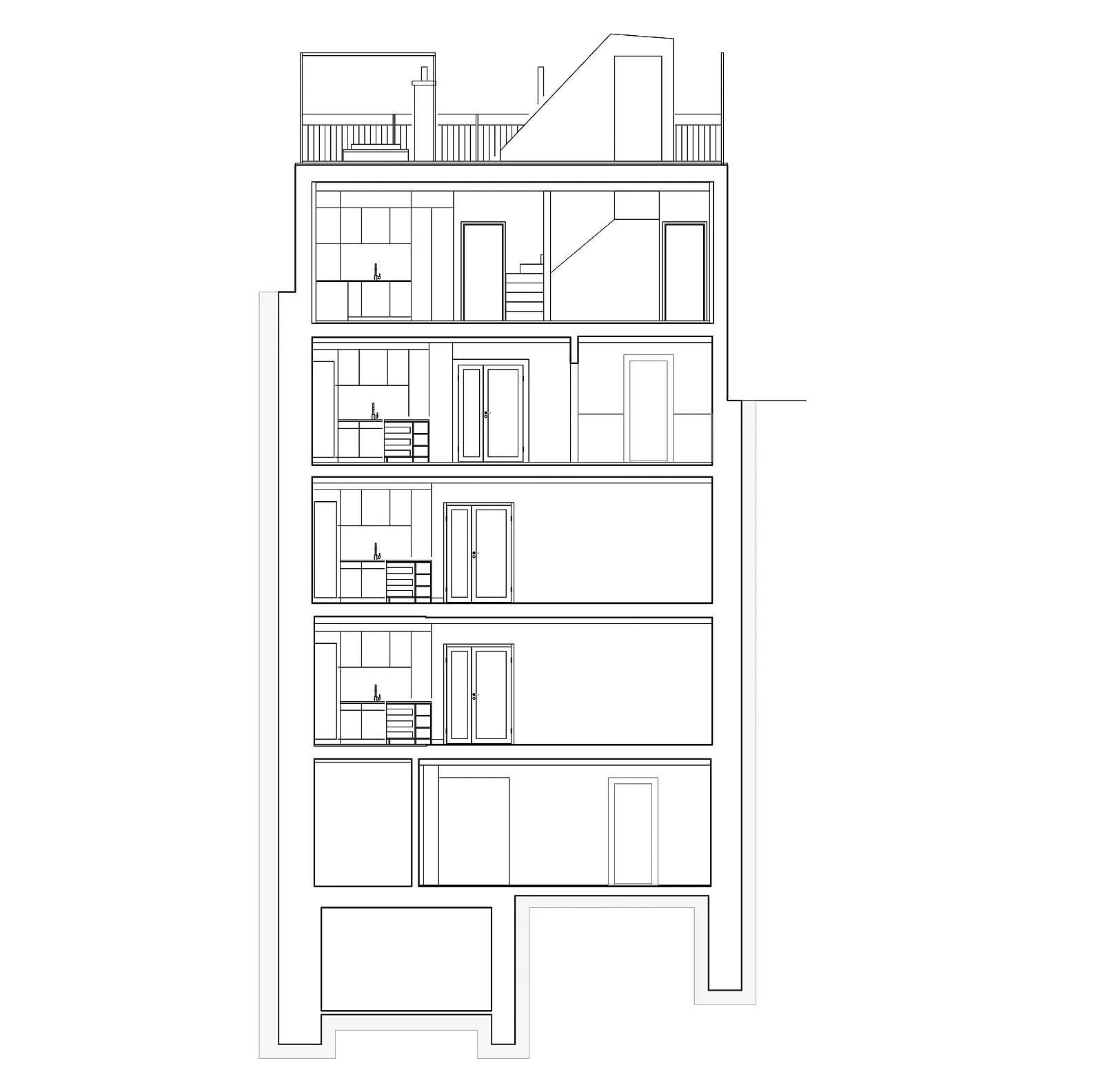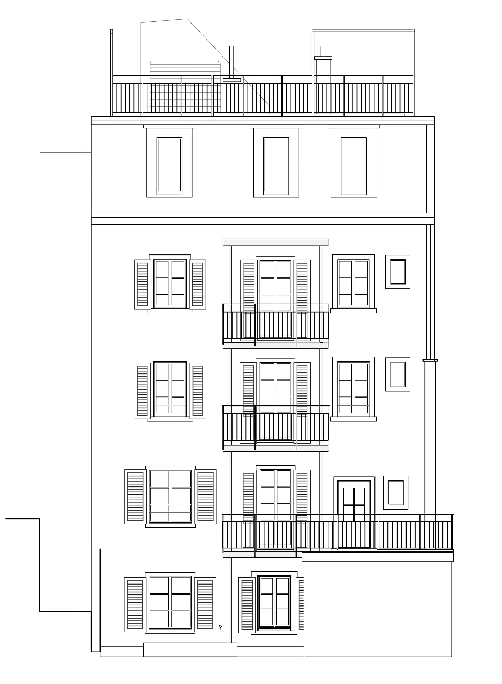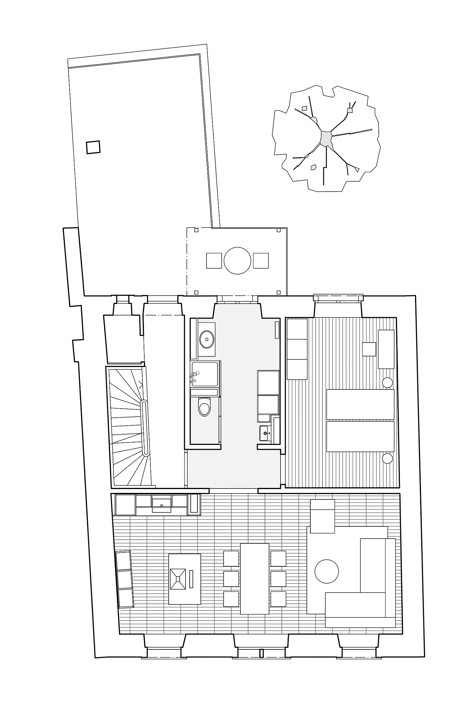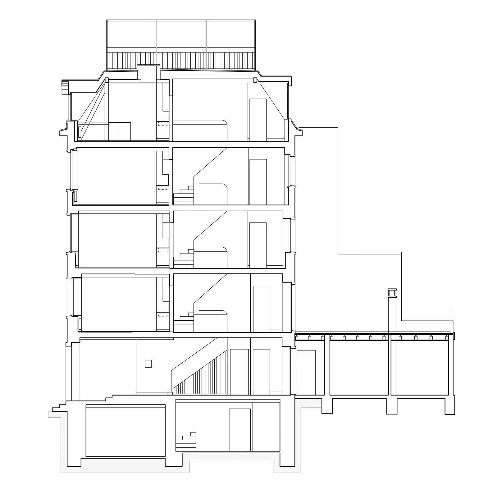 Bei der Sanierung des Hauses wurde das gesamte Dachgeschoss neu gedämmt und die bestehenden Mansardenzimmer zu einer Wohnung umgebaut. Der Zugang zur Dachterrasse wurde neu gestaltet und die Zinne zur Dachterrasse ausgebaut.