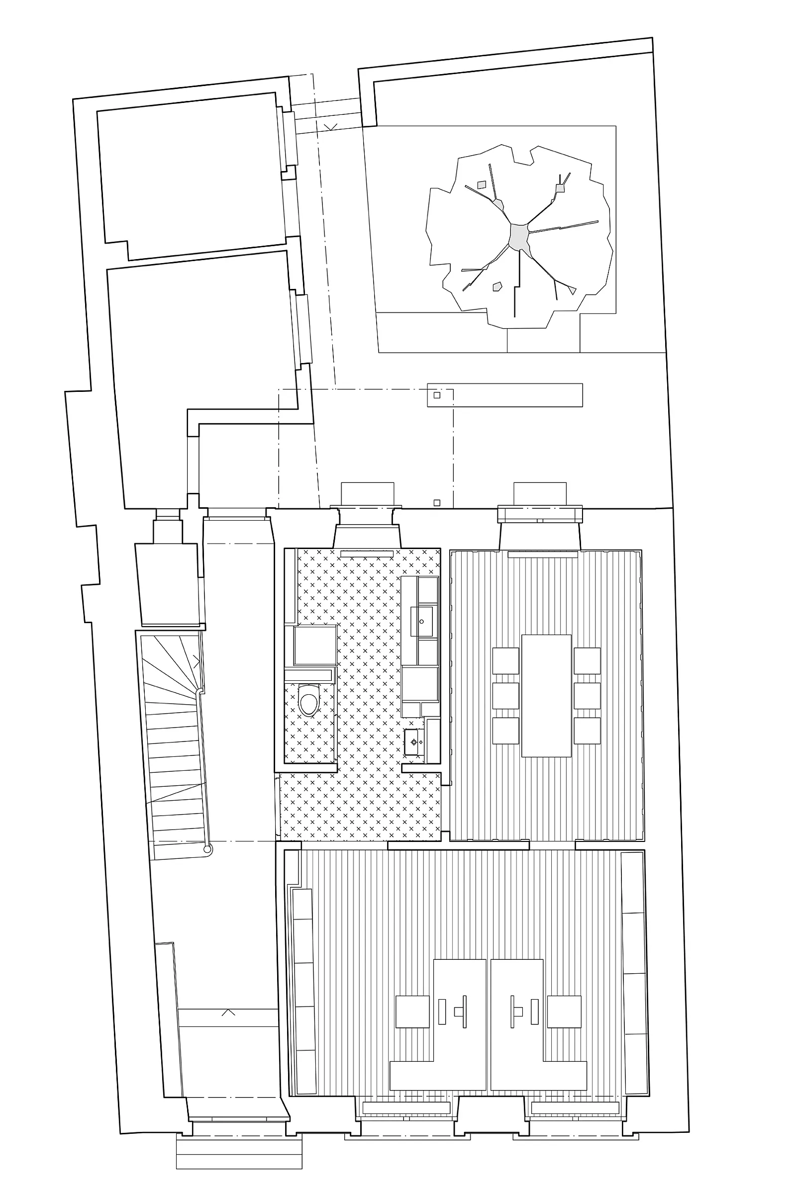 Der Gewerberaum im Erdgeschoss wurde zu einem Büro mit separatem Sitzungszimmer umgebaut und erhielt zum Hof hin eine kleine Küchenzeile sowie eine neue Nasszelle.